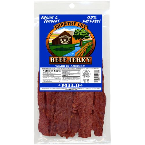 3.5oz of our Mild flavor Buffalo Bills Country Cut Beef Jerky in random size pieces. Our not too tame Mild Country Cut Beef Jerky is one of the best you'll ever eat. We make this jerky by simply rubbing the beef with paprika, garlic, and spices, and then smoking it for the day to give you a pleasing beefy flavor in every bite! Proudly made in the USA with US-raised beef. Introduced in 2005, our Country Cut Beef Jerky is one of our hottest selling products - customers nationwide find it simply addictive. This easy to chew, whole muscle beef jerky is thick cut, moist, and tenderlicious! Buffalo Bills Country Cut Beef Jerky is available in 6 great flavors (Barbecue, Chipotle Habanero, Honey Pepper, Mild, Spicy, and Teriyaki) and 3 size packs (1.75oz, 3.5oz, and 8oz).